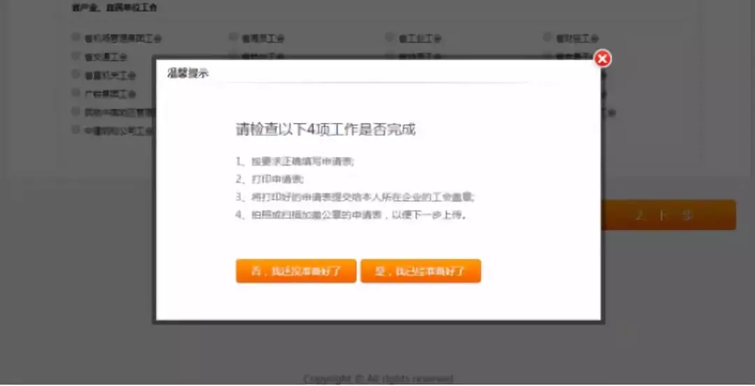 2.根據(jù)“溫馨提示”確認(rèn)是否已完成,如果未完成,點(diǎn)擊【否,我還沒準(zhǔn)備好】,并隨后完成所有工作;如果已完成,點(diǎn)擊【是,我已經(jīng)準(zhǔn)備好了】,進(jìn)入下一個頁面。在申報過程中,長時間在網(wǎng)站頁面停留,會遇到頁面過期,遇到此問題需重新登錄;