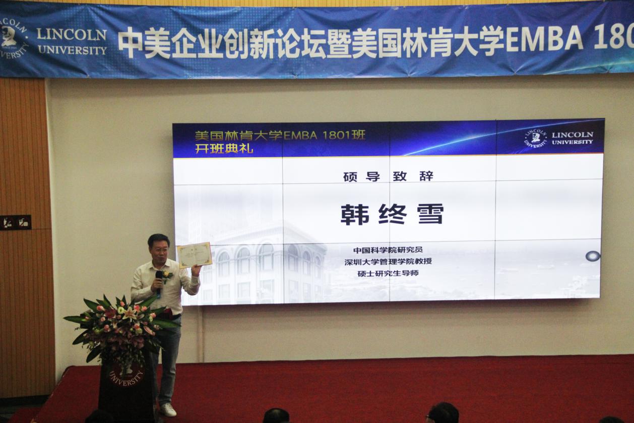深圳新聞網(wǎng)訊 10月27日上午,由美國林肯大學(xué)EMBA深圳教學(xué)中心舉辦的《中美企業(yè)創(chuàng)新論壇》暨美國林肯大學(xué)EMBA1801班開班典禮,在深圳科技園香港科技大學(xué)報告廳舉行。論壇邀請了美國林肯大學(xué)校方代表楊崇藝博士、方勝祥先生、美國加州州立大學(xué)計算機系正教授 陶翼青 、中科院研究員韓終雪教授出席。美國林肯大學(xué)EMBA1801班的同學(xué)們、來自深圳教育行業(yè)、中國企業(yè)家代表 以及 媒體記者等160多位嘉賓 參加活動 。