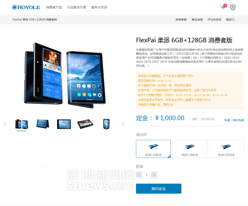 記者在柔宇官網看到,已于11月1日開啟預購的柔派消費者版有3個型號,需預付定金1000元,每天的預售時間段只有早上下午和晚上3個時間段,每個時間段只有58分鐘。從預售方式上看,吊足了人們的胃口