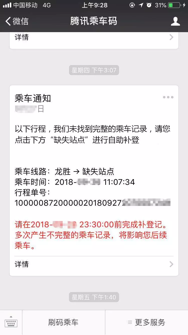劉先生家住龍崗,工作地在福田,經(jīng)常乘坐地鐵往返于六約站和福田站。自從深圳地鐵上線了二維碼掃碼過(guò)閘功能,劉先生出門(mén)就只帶一部手機(jī),每天都是輕裝上陣,進(jìn)站乘車(chē)非常方便。11月7日這天,劉先生的手機(jī)微信突然收到一條推送信息,提醒他前一天早上的乘車(chē)信息不完整,需要進(jìn)行“補(bǔ)登”操作,這究竟是怎么一回事呢?
