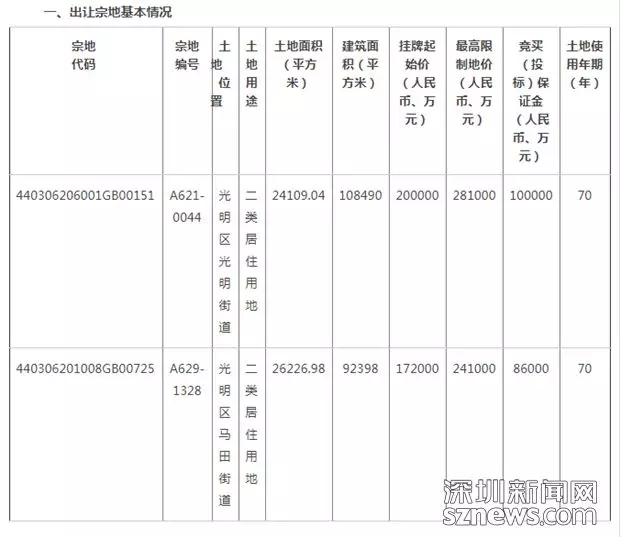 本次出讓的兩宗地分別是位于光明區(qū)光明街道的A621-0044宗地和位于光明區(qū)馬田街道的A629-1328宗地。前者土地面積24109.04平方米,建筑面積108490平方米,掛牌起始價20億元;后者土地面積26226.98平方米,建筑面積92398平方米,掛牌起始價17.2億元。土地使用權均為70年。其中,A621-0044宗地人才住房初始配建面積為9800平方米,A629-1328宗地人才住房初始配建面積為8100平方米。