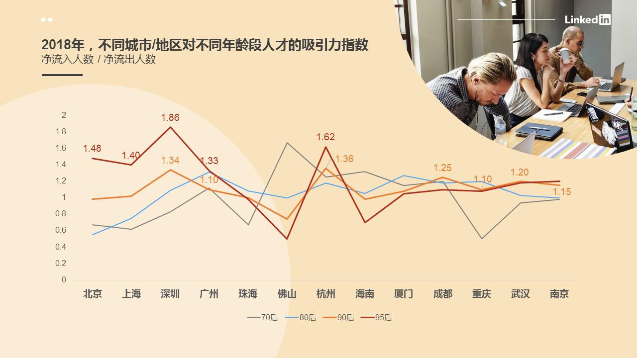 通過(guò)對(duì)比不同城市及地區(qū)的人才吸引力指數(shù)(凈流入人數(shù)/凈流出人數(shù)),領(lǐng)英數(shù)據(jù)顯示:對(duì)于新畢業(yè)的95后年輕人來(lái)說(shuō)一線城市仍是畢業(yè)后職場(chǎng)起步的首選。