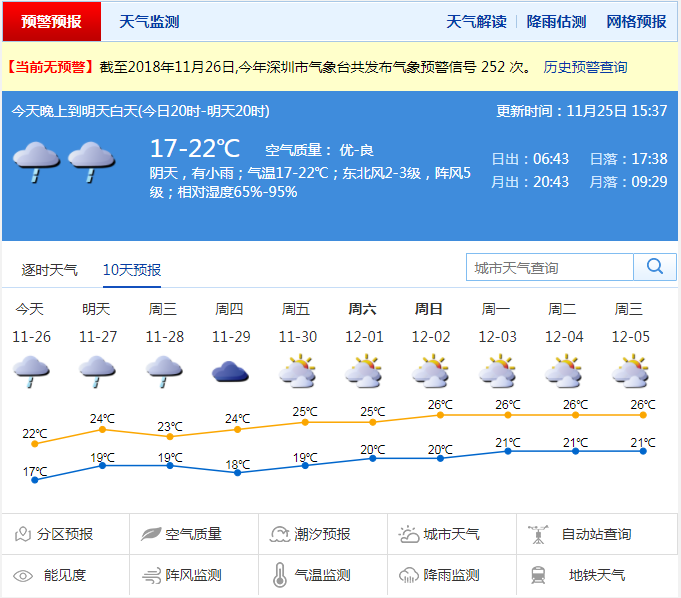 深圳新聞網(wǎng)11月26日訊(記者 施冰冰) 記者從深圳市氣象臺(tái)了解到今天陰天,間中有小雨,氣溫17℃-22℃;周二到周四以陰天為主,間中有分散小雨;周五到周日多云,可見陽(yáng)光,氣溫回升。