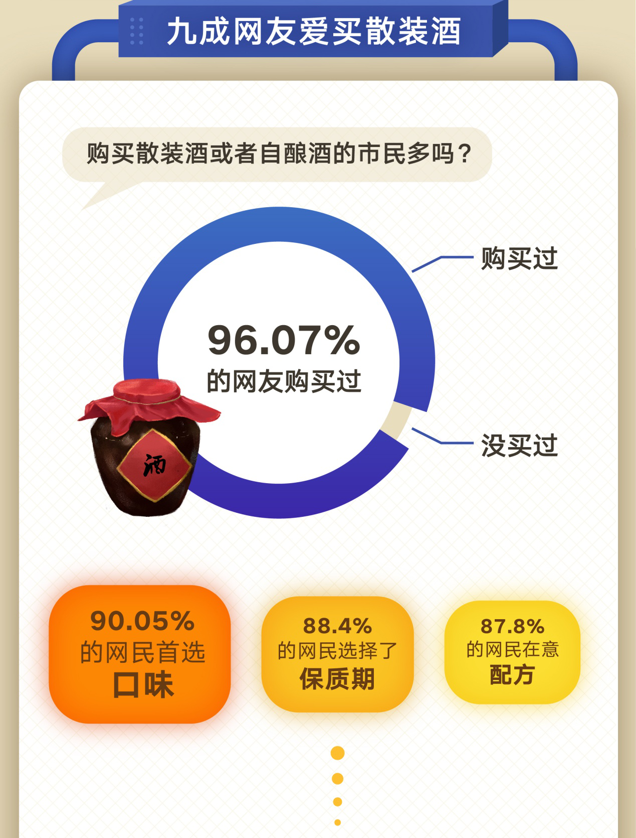 在深圳,購買散裝酒或者自釀酒的市民多嗎?根據(jù)此次調(diào)查數(shù)據(jù)顯示,高達(dá)96.07%的網(wǎng)友都曾購買過,可見散裝酒和自釀酒的受歡迎程度。 買散裝酒最看重什么?調(diào)查數(shù)據(jù)顯示,90.05%的網(wǎng)民首選口味;88.4%的網(wǎng)民選擇了保質(zhì)期;87.8%的網(wǎng)民在意配方,而對(duì)安全性關(guān)注的只有7.95%。