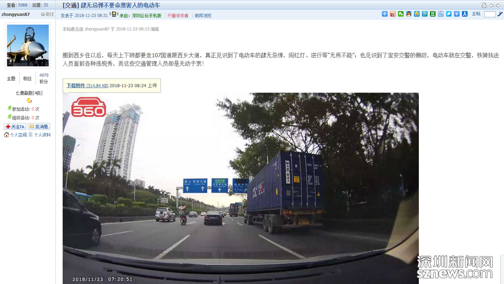 深圳新聞網(wǎng)11月28日訊(記者 劉婷)“電動車闖紅燈、逆行、搶道等‘無所不能'?!苯?深圳論壇網(wǎng)友“zhongyuan87”發(fā)帖吐槽電動車在107國道、西鄉(xiāng)大道無視交通規(guī)則肆意駕駛,擾亂正常秩序。(網(wǎng)帖:https://szbbs.sznews.com/thread-3824524-1-1.html)