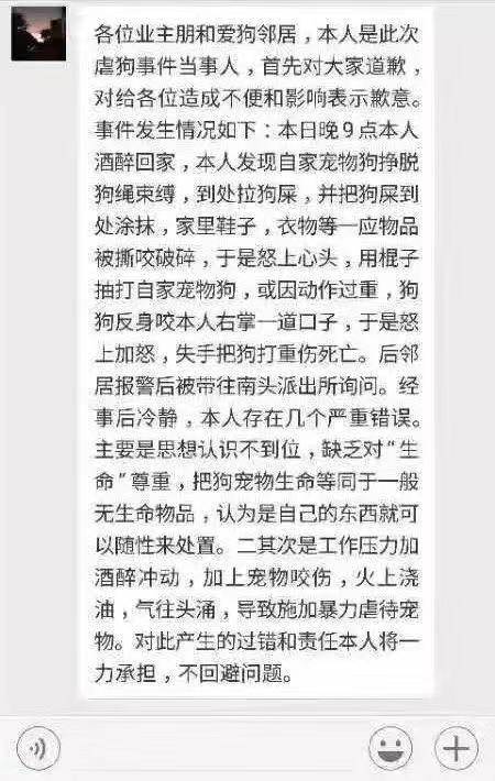 當(dāng)天深夜,男子在業(yè)主群中道歉,稱(chēng)自己晚上9點(diǎn)醉酒回家,發(fā)現(xiàn)自家寵物狗掙脫狗鏈,到處拉屎還將家里的鞋子、衣物撕咬破碎,抽打自家寵物狗時(shí),又被反咬一口,才會(huì)失手將狗打成重傷,同時(shí)男子表示“對(duì)此產(chǎn)生的過(guò)錯(cuò)和責(zé)任本人將一力承擔(dān),不回避問(wèn)題?!?/p>