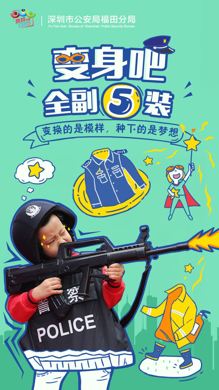 福田警方從11月26日開始,連續(xù)推出開放日倒計時5期主題海報:“變身吧,全副‘5’裝”、“趣玩吧,‘四’意嬉戲”、“學(xué)習(xí)吧,舉一反‘3’”、“見面吧,為你‘2’來”、“一起吧,‘1’起警彩”,向市民發(fā)出邀請函,通過官方微信、微博等新媒體平臺發(fā)布,搶先看精彩。