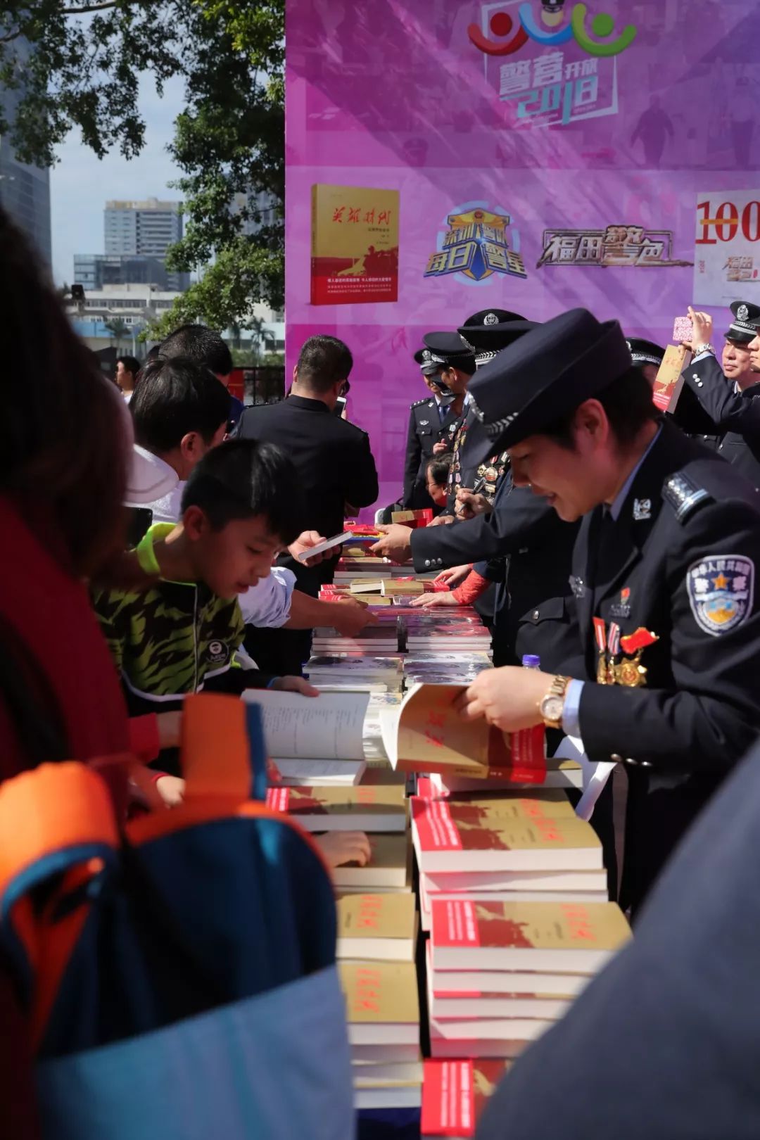 當(dāng)天上午,人民公安出版社副總編李國強(qiáng)、著名作家李迪與市公安局領(lǐng)導(dǎo)來到福田分局開放點現(xiàn)場為深圳公安“每日警星”代表簽名贈書。在贈書點,許多市民排起了長隊,領(lǐng)取《英雄時代——深圳警察故事》。