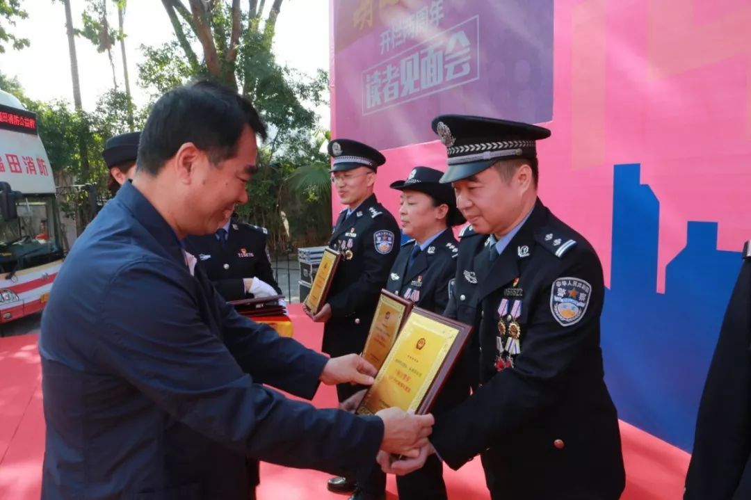 深圳市公安局與深圳特區(qū)報合辦的“每日警星”專欄讀者粉絲見面會在福田分局開放點火熱開展,來自深圳警隊刑偵、掃黑攻堅、治安、社區(qū)、特警、交警、預(yù)審等各個崗位的14名“每日警星”代表現(xiàn)場激情合唱中國人民警察警歌;徐文海與深圳報業(yè)集團(tuán)黨組副書記、副社長、總編輯周斌共同為“每日警星”代表頒發(fā)紀(jì)念牌。