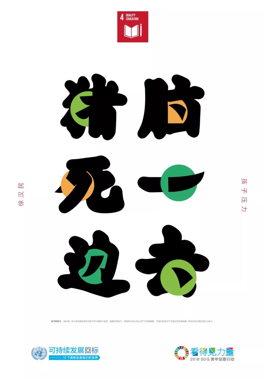作品解釋 /現(xiàn)在孩子的壓力越來越大,導(dǎo)致很多孩子心理灰暗、暴力犯罪、自我封閉等現(xiàn)象,其中一個(gè)原因是父母期望和恨鐵不成鋼打罵給孩子帶來沉重的壓力。由此作者直接用那些語句來設(shè)計(jì),這些字體中穿插著一個(gè)小圓點(diǎn)即孩子們的腦袋,他們被這些語言帶來的無形壓力刺痛,整個(gè)字比較圓潤只有關(guān)鍵的地方鋒利無比,就像一把無形的刀插在他們心上。