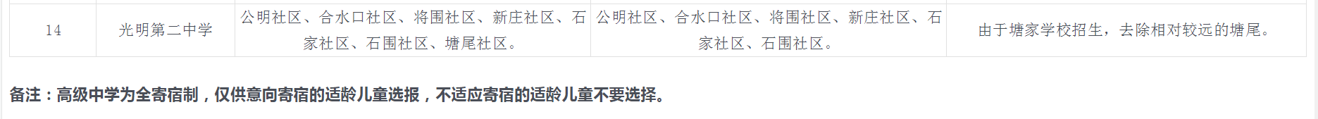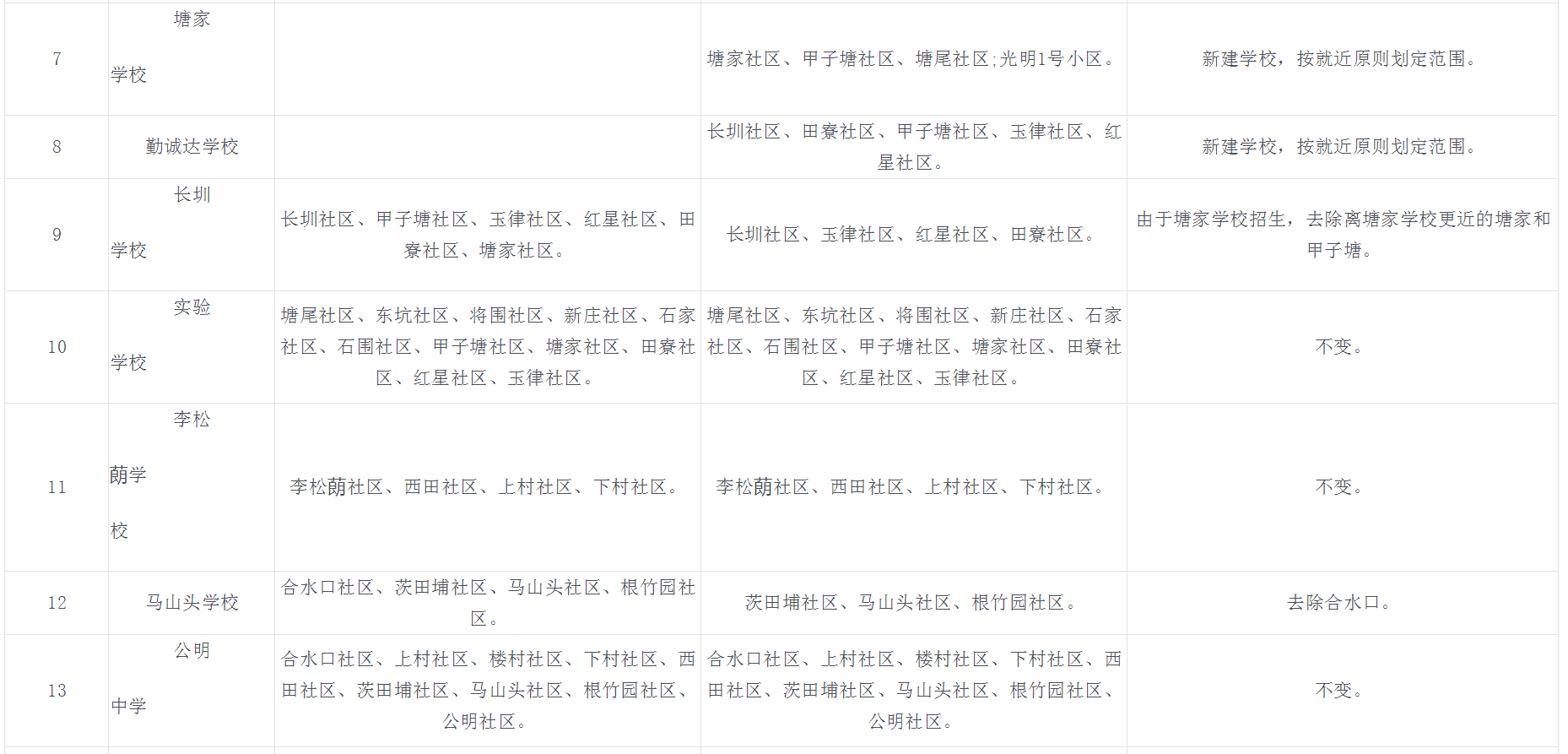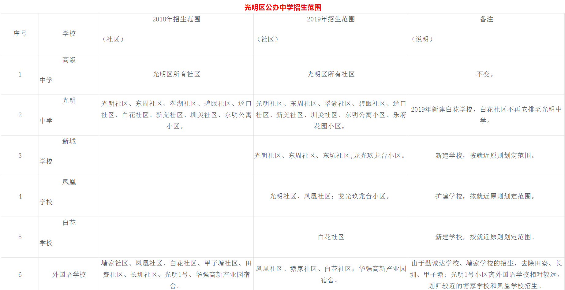 據悉,2019年光明區(qū)招生原則是原有學校招生范圍盡量保持不變,新增學校招生范圍根據招生規(guī)模、生源情況等按就近原則劃定。由于增加了勤誠達學校、信宏城小學、新城學校、塘家學校、白花學校等5所新建學校,鳳凰學校擴建項目也已完成,因此,招生片區(qū)擬做調整為:白花社區(qū)不再安排至光明中學;光明外國語學校招生去除田寮、長圳、甲子塘片區(qū);光明1號小區(qū)劃歸較近的塘家學校和鳳凰學校招生;馬山頭學校招生去除合水口片區(qū);光明第二中學招生去除相對較遠的塘尾片區(qū)。公明二小、下村小學招生去除相對較遠的公明社區(qū);長圳學校招生去除相對較遠的塘家社區(qū)、甲子塘社區(qū)。鳳凰學校招生去除白花,增加光明社區(qū)。
