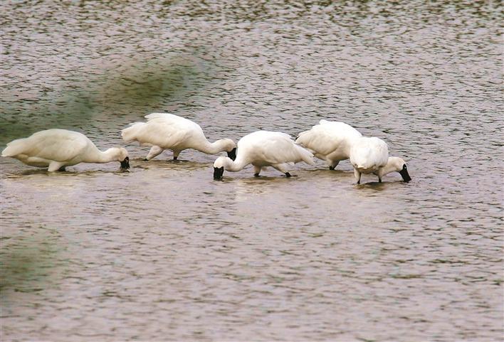 在2號(hào)魚(yú)塘里捕食的黑臉琵鷺。