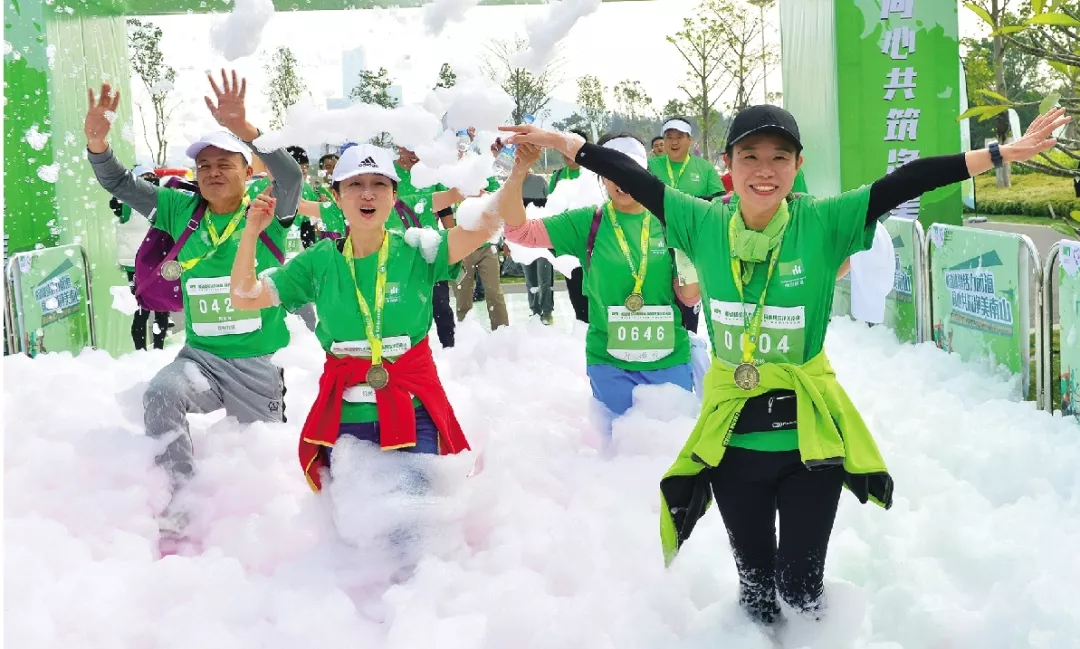 南山街道2018環(huán)鏟灣渠-桂廟渠生態(tài)歡樂跑全長5公里,共設(shè)置2個環(huán)保生態(tài)泡泡點(diǎn)、1個團(tuán)隊任務(wù)挑戰(zhàn)游戲點(diǎn)、4個生態(tài)環(huán)保勛章打卡點(diǎn),并設(shè)有南山街道精品特色社區(qū)黨建和生態(tài)環(huán)保建設(shè)的知識闖關(guān)答題環(huán)節(jié)。參與者到達(dá)終點(diǎn),完成全部闖關(guān)任務(wù)之后可以領(lǐng)取一枚生態(tài)環(huán)保勛章。位于終點(diǎn)主會場的“充氣桌球”、“超級投籃”、“一飛沖天”、“超級扣籃”生態(tài)環(huán)保嘉年華游戲區(qū)域,更是讓全體跑友陷入了歡樂的海洋。起點(diǎn)、中途和終點(diǎn)都設(shè)有環(huán)境保護(hù)和精品特色社區(qū)創(chuàng)建的宣傳展板,多方位展示南山街道在河渠治理和精品特色社區(qū)建設(shè)方面做出的成績。