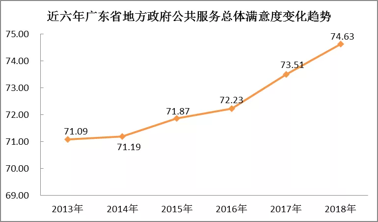 深圳新聞網(wǎng)2019年1月3日訊 近日,廣東省省情調(diào)查研究中心、廣東省社會(huì)科學(xué)院績(jī)效評(píng)估中心公布了《2018年廣東省地方服務(wù)型政府建設(shè)系列調(diào)研報(bào)告》(以下簡(jiǎn)稱(chēng)“報(bào)告”),今年該調(diào)研根據(jù)“公共服務(wù)”和“營(yíng)商環(huán)境”雙向維度,由“廣東省地方政府公共服務(wù)公眾評(píng)價(jià)調(diào)查”和“廣東省營(yíng)商環(huán)境公眾滿意度調(diào)查”兩個(gè)調(diào)查組成。今年調(diào)查共回收有效問(wèn)卷28156份,結(jié)果顯示:2018年廣東省地方政府公共服務(wù)總體滿意度得分為74.63分,較去年提高1.12分,創(chuàng)十年來(lái)最高水平。