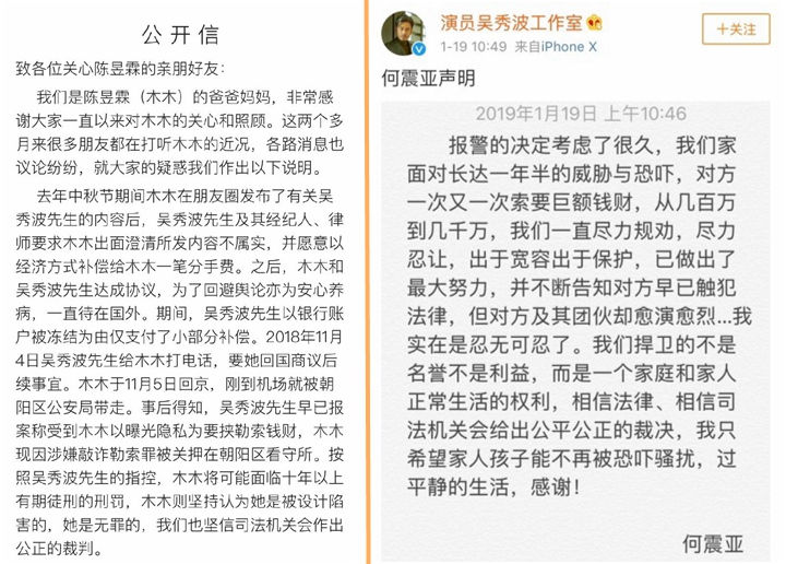 深圳新聞網(wǎng)1月22日訊(記者 張玲)近日,演員吳秀波婚內(nèi)出軌事件再度發(fā)酵在微博引發(fā)熱搜,而這次事件的主角則是之前銷聲匿跡已久的陳昱霖(藝名)。2019年1月18日,陳昱霖父母微博公開發(fā)表聲明稱女兒被吳秀波欺騙回國后,吳秀波以“曝光隱私威脅勒索錢財”為由報警,女兒在下飛機后即被警方抓捕。隨后,吳秀波妻子何震亞發(fā)表聲明反擊,稱陳昱霖多次威脅索要巨額財務(wù),數(shù)額一度高達(dá)千萬,在忍無可忍的情況下才選擇報警,希望通過司法途徑維護(hù)自己的權(quán)益。