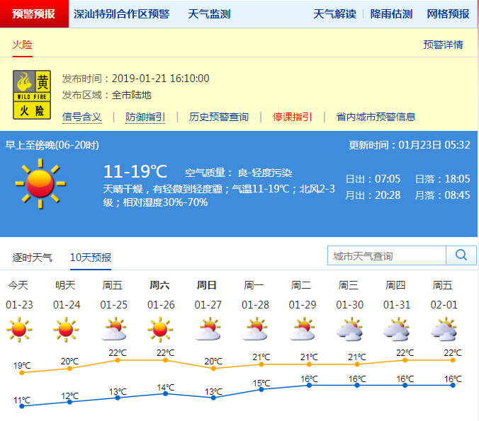 深圳氣象局預(yù)計(jì)23日天晴干燥,部分地區(qū)能見度較低,有輕微到輕度霾;氣溫11-19℃;偏北風(fēng)2-3級(jí);相對(duì)濕度30%-70%,濕度低,火險(xiǎn)預(yù)警生效中。24-27日依然晴天干燥,部分時(shí)間有輕微到輕度霾;28日多云,濕度回升。天氣持續(xù)干燥,日溫差大,早晚較冷。