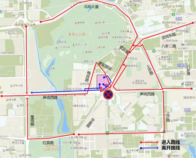 車行交通調整為:筍崗西路 -梅崗路;紅荔路 -皇崗路 -筍崗西路 -梅崗路;筍崗西路 -泥崗西路 -靜逸街(梅崗南街)。