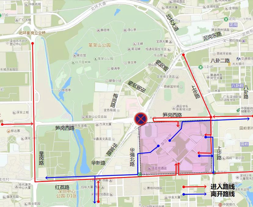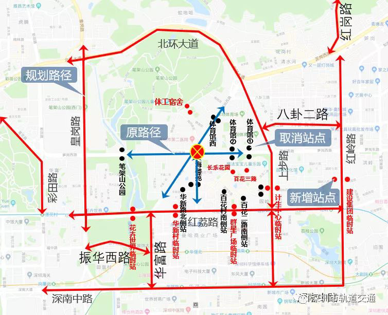 車行交通調整為:皇崗路 -紅荔路 -華富路 -華新路;上步路 -紅荔路 -華強北路 -華新路或上步路 -筍崗西路 -百花四路 -華新路。