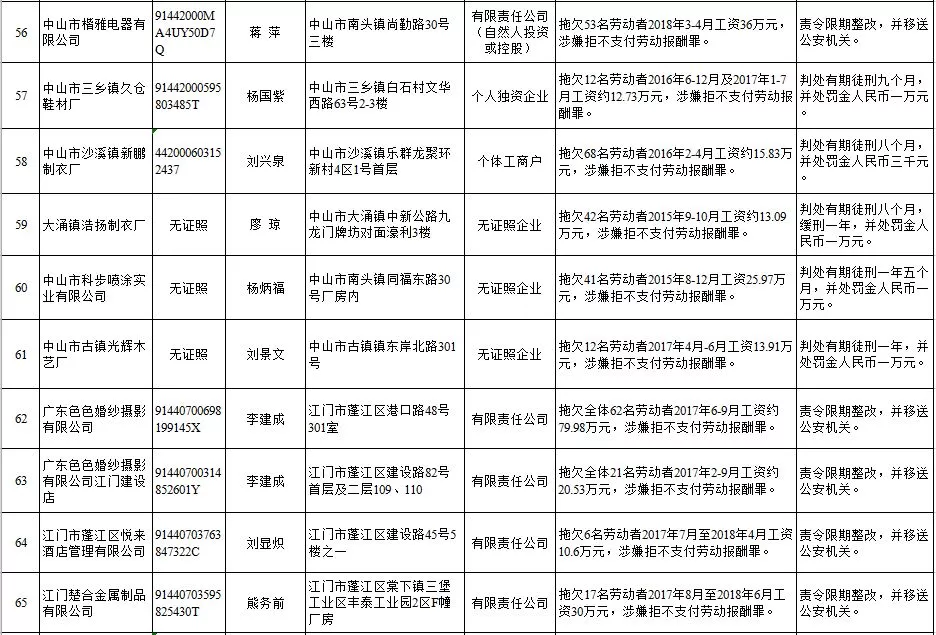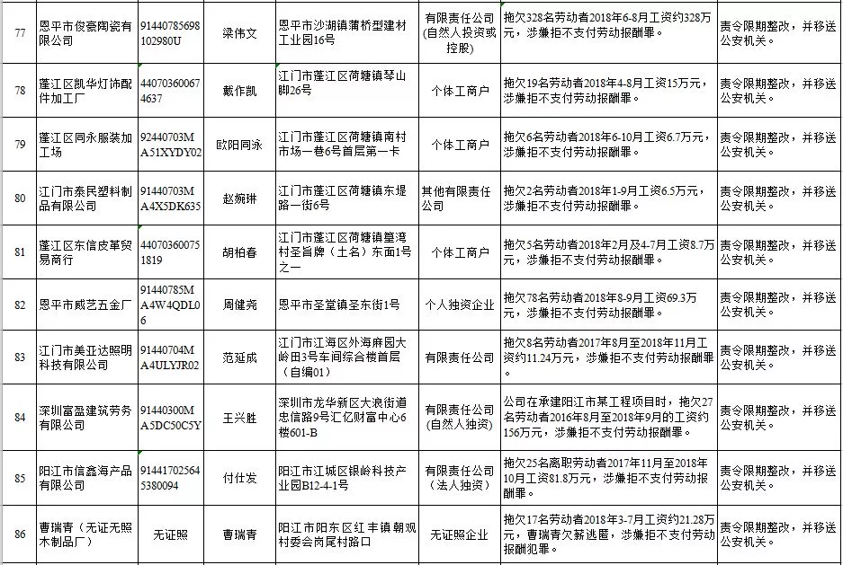 深圳新聞網(wǎng)2019年1月29日訊 (記者 劉婷)據(jù)廣東發(fā)布消息,省人社廳近日公布,2019年第一批用人單位重大勞動(dòng)保障違法行為名單。到底是哪些企業(yè)在惡意欠薪?這些“老賴(lài)”企業(yè)的營(yíng)業(yè)執(zhí)照、地址、法人等等超全信息都在這!