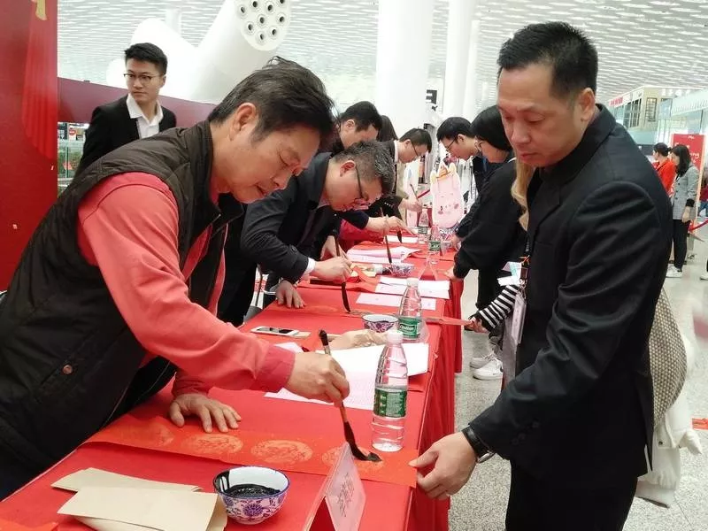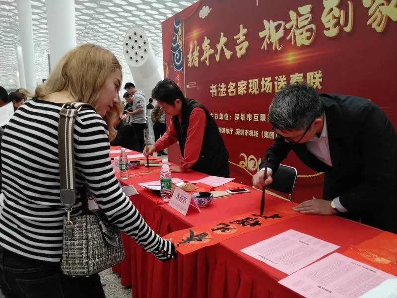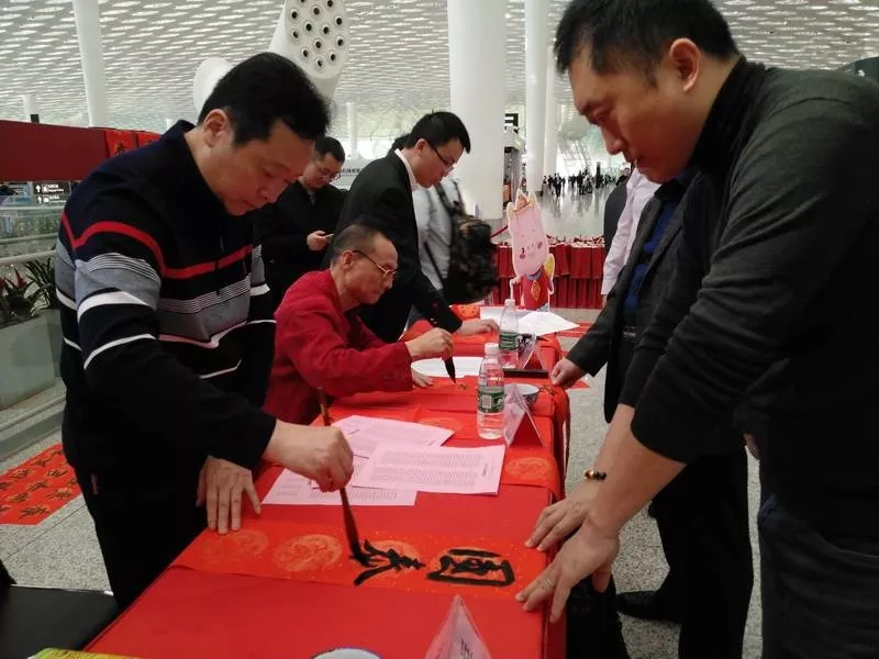 寶安區(qū)書法家協(xié)會(huì)主席李高揚(yáng)介紹,在機(jī)場(chǎng)送春聯(lián)很有意義,可以給全國(guó)各地的朋友們送上新年祝福。這次深圳發(fā)布廳攜手深圳機(jī)場(chǎng)舉辦活動(dòng),寶安區(qū)書法家協(xié)會(huì)集結(jié)高手出動(dòng)為群眾服務(wù),為市民送去祝福。他祝大家新春快樂,闔家幸福。