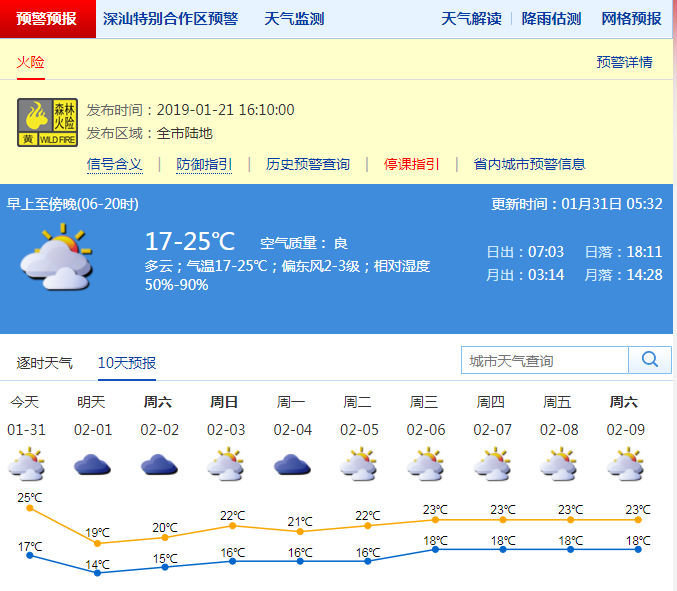 深圳新聞網(wǎng)2019年1月31日訊 深圳氣象局預(yù)計(jì)31日陰天間多云,偶有零星小雨,有輕霧或輕微霾,氣溫16-25℃;1-5日陰天間多云,部分時(shí)間可見陽光,間中有零星小雨,氣溫小幅波動(dòng),其中1日受冷空氣影響,沿海和高地偏北風(fēng)最大陣風(fēng)7級,最低氣溫略降3℃左右,3-4日暖濕氣流加強(qiáng),早晚有輕霧或霧。