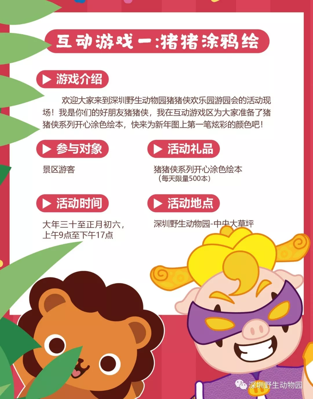 深圳野生動(dòng)物園攜手豬豬俠、攜程網(wǎng)重磅推出“豬豬俠歡樂(lè)游園會(huì)”大型系列主題活動(dòng)。豬豬俠率領(lǐng)小伙伴們空降深圳野生動(dòng)物園,大鬧動(dòng)物王國(guó)開啟多重活動(dòng),精彩不停!
