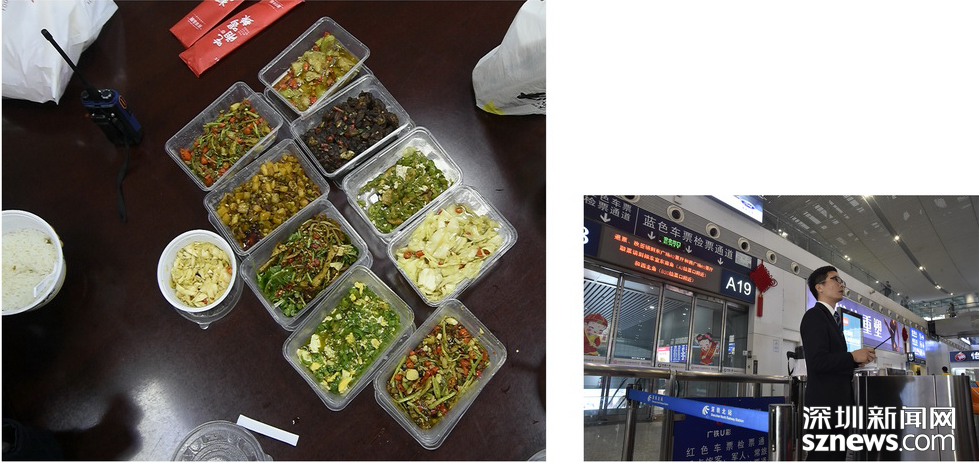 春運第一天,人流如織。從下午2點半上班開始,聶新強(qiáng)忙了5個鐘頭,安全送走大約20萬人。晚上七點半,在各閘機(jī)口頂替了五位同事吃晚飯之后,聶新強(qiáng)終于吃上了“豪華”外賣“快餐”,“豪”的是一人獨享八人份,“快”的是只用了10分鐘不到就結(jié)束了戰(zhàn)斗。