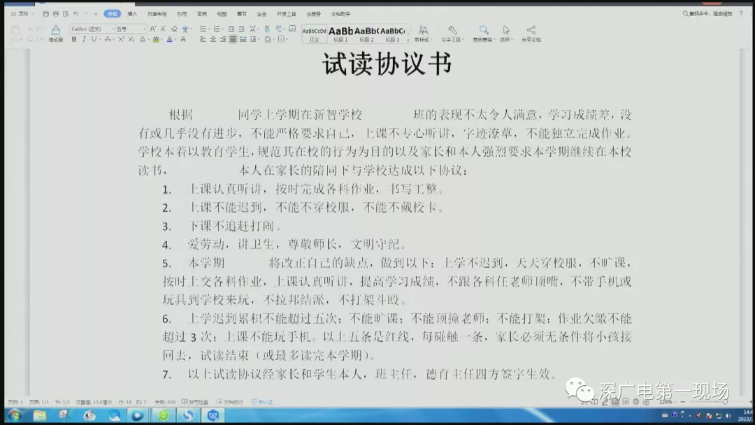 這份《試讀協(xié)議書》的大概內(nèi)容如下:由于某某同學(xué)上學(xué)期表現(xiàn)不令人滿意,學(xué)習(xí)成績差,沒有或幾乎沒有進(jìn)步,不能嚴(yán)格要求自己。學(xué)生在家長的陪同下與學(xué)校達(dá)成以下協(xié)議。協(xié)議第六條注明:上學(xué)遲到累計不能超過5次;不能曠課;不能頂撞老師;不能打架;作業(yè)欠繳不能超過3次;上課不能玩手機(jī)。以上條款是紅線,每觸碰一條,家長必須無條件將小孩接回去,試讀結(jié)束?;蛘咦疃嘧x完本學(xué)期。
