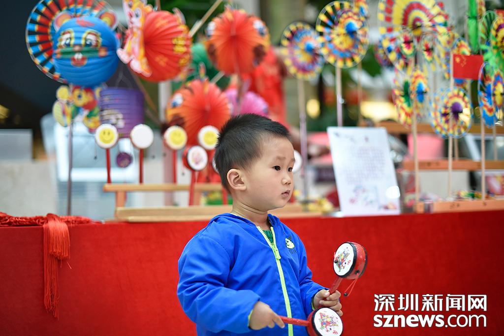 風(fēng)車(chē)攤檔前面,一位拿著撥浪鼓的小男孩駐足觀看節(jié)目