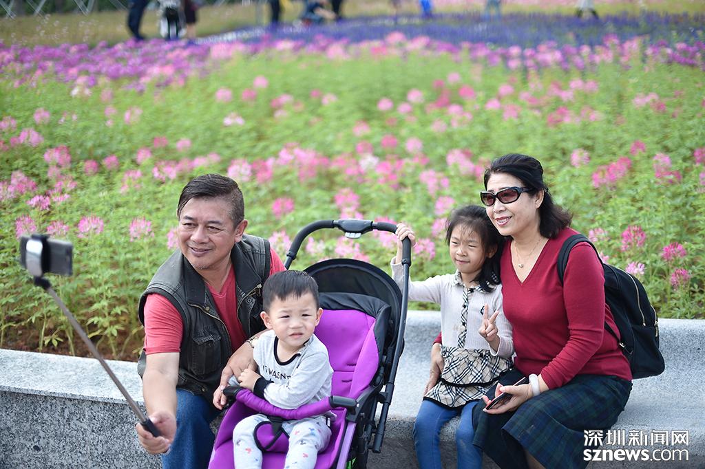 醉蝶花花海前,一家老小自拍留念