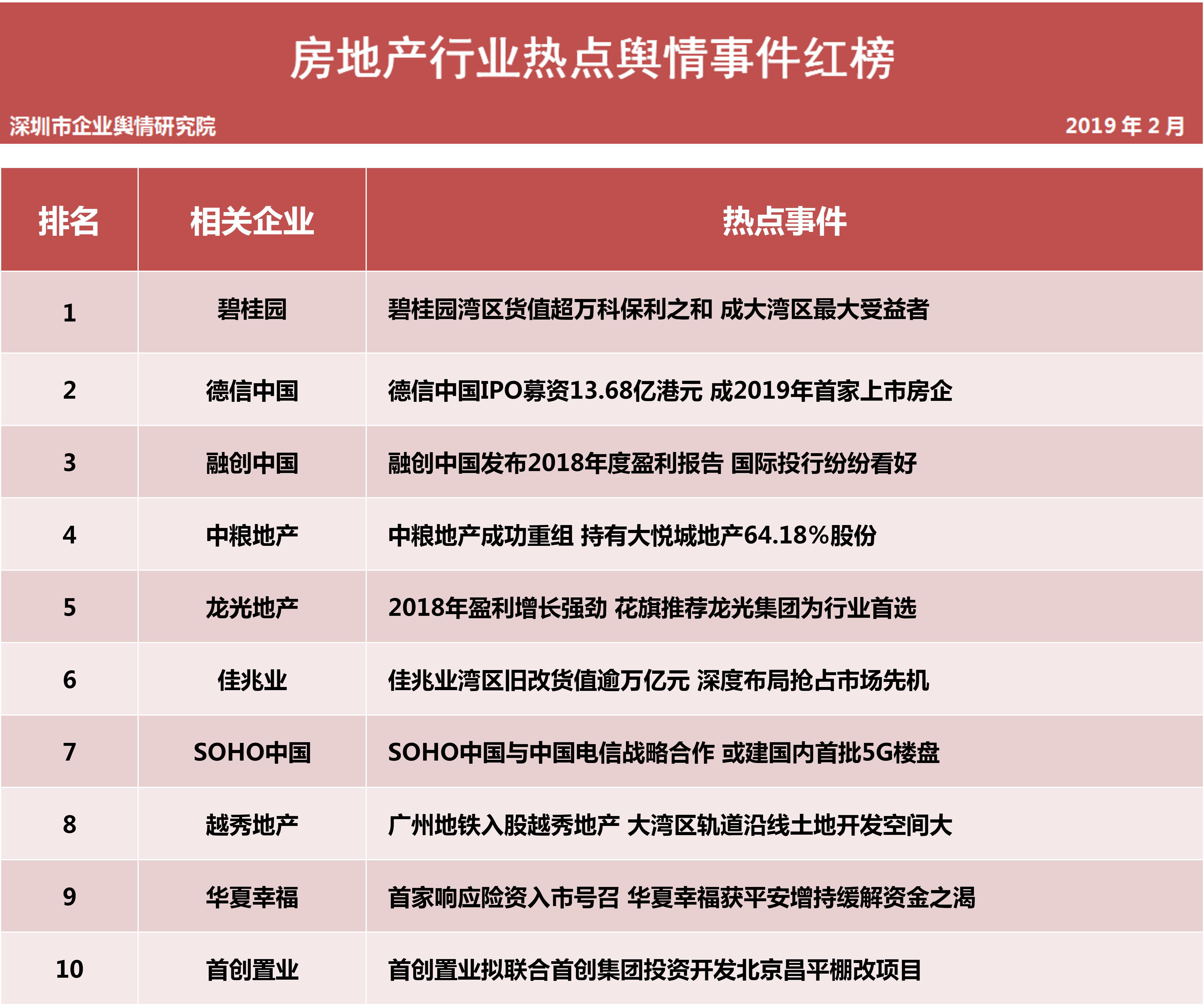深圳新聞網(wǎng)2019年3月5日訊 (記者田志強(qiáng) 通訊員陳文光)3月5日,深圳企業(yè)輿情研究院發(fā)布第十三批企業(yè)輿情榜單。本次榜單重點聚焦房地產(chǎn)及醫(yī)藥保健兩個行業(yè)。房地產(chǎn)行業(yè)企業(yè)輿情榜單由房地產(chǎn)行業(yè)熱點輿情事件排行榜(紅、黑榜)及房地產(chǎn)企業(yè)公眾形象排行榜組成。