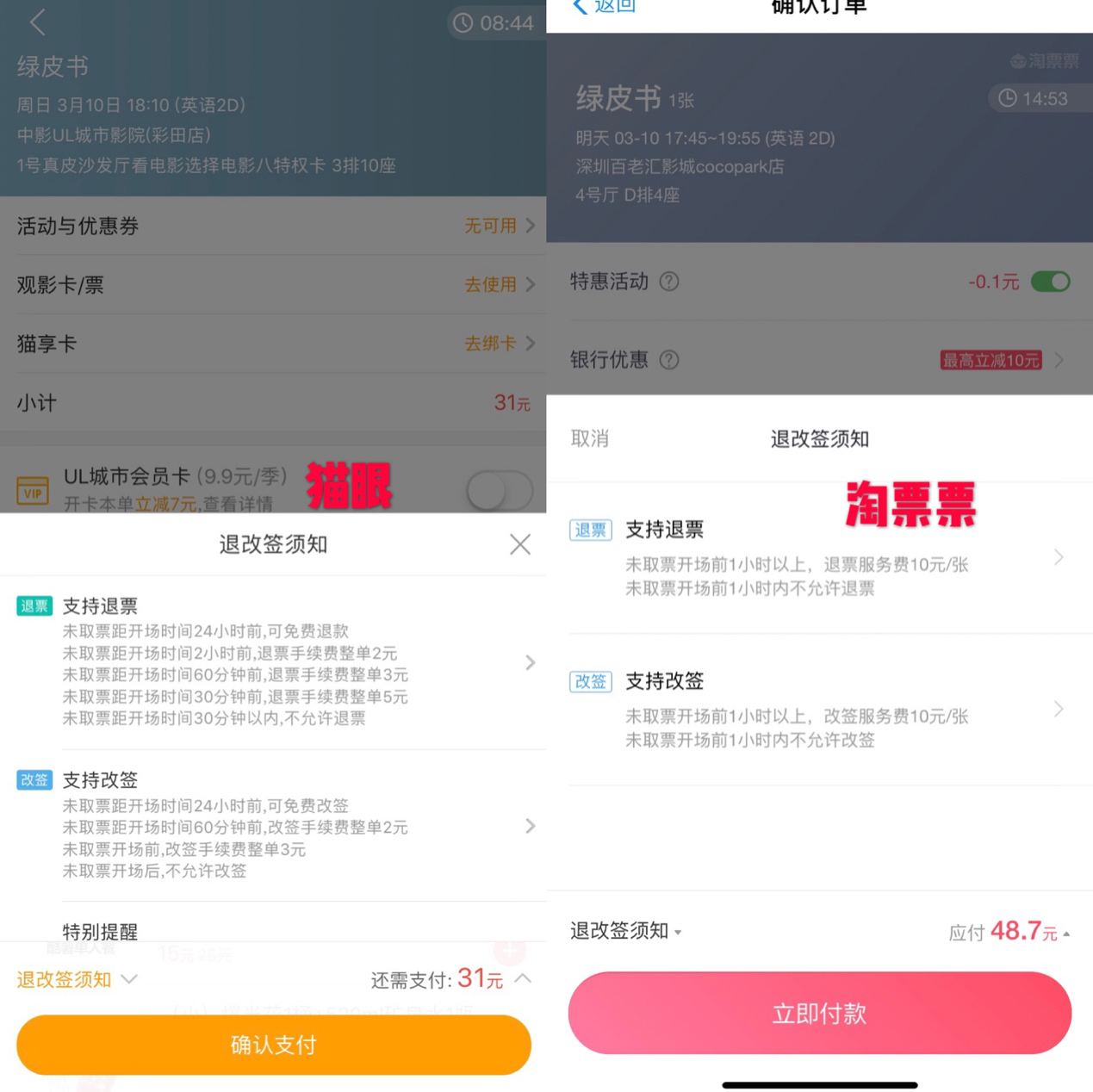 記者發(fā)現(xiàn),線上線下“退改簽”電影票均設(shè)置了門檻,對(duì)退票、改簽的時(shí)間和手續(xù)費(fèi)均有不同的規(guī)定。