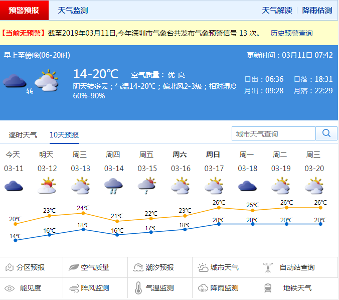 深圳新聞網(wǎng)2019年3月11日訊 自3月5日起,深圳已連續(xù)6日出現(xiàn)降雨,不少市民抱怨,再不出太陽,衣服都要發(fā)霉了。好在持續(xù)多日的降雨終于結(jié)束,“流浪”許久的太陽要回歸了。記者從市氣象局了解到,周一(11日)陰天轉(zhuǎn)多云可見陽光,周二周三(12-13日)多云間晴天,氣溫回升。