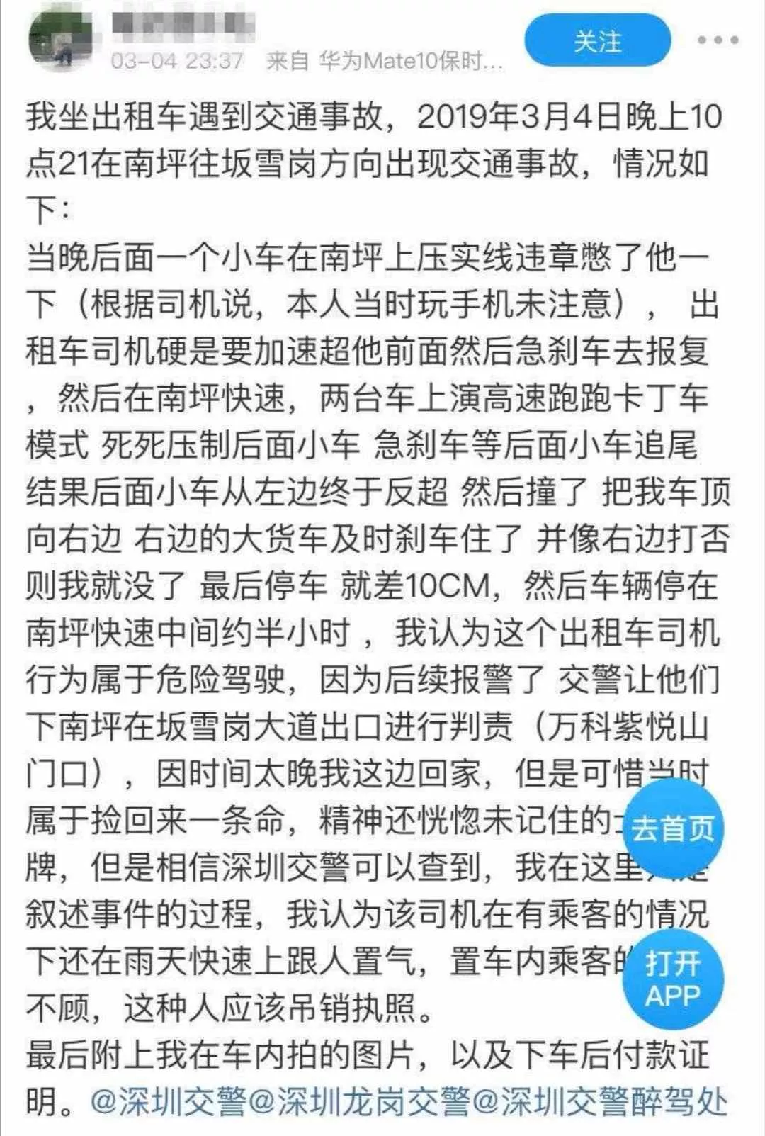 深廣電直播深圳2019年3月11日訊 近日有網(wǎng)友微博舉報,3月4日晚其乘坐的一輛出租車與其他車斗氣引發(fā)交通事故,隨后深圳交警機(jī)動訓(xùn)練大隊對雙方司機(jī)進(jìn)行調(diào)查。