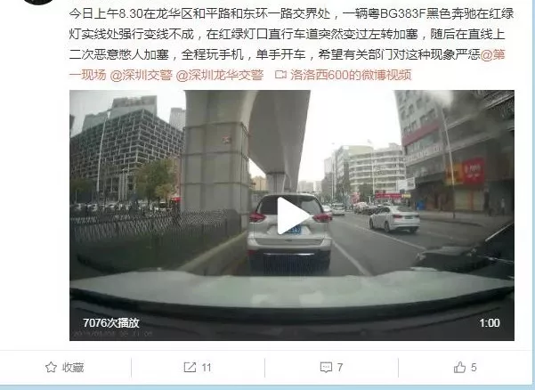 深廣電直播深圳2019年3月13日訊 近日,深圳交警收到一則微博舉報(bào),在龍華區(qū)和平路和東環(huán)一路交匯處,一輛黑色奔馳小車在等待紅綠燈時(shí)強(qiáng)行變線未果后在直行車道突然變道左轉(zhuǎn)加塞,險(xiǎn)些與后方車輛發(fā)生擦碰事故。舉報(bào)人表示,當(dāng)時(shí)黑色奔馳小車司機(jī)在駕駛車輛時(shí)不僅單手開車,更是全程玩手機(jī)。