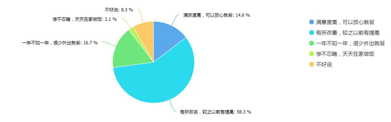 對(duì)于深圳白領(lǐng)非常關(guān)心的餐飲店面,接近6成受訪(fǎng)者認(rèn)為比之前有所改善,14.6%受訪(fǎng)者認(rèn)為可以放心就餐。