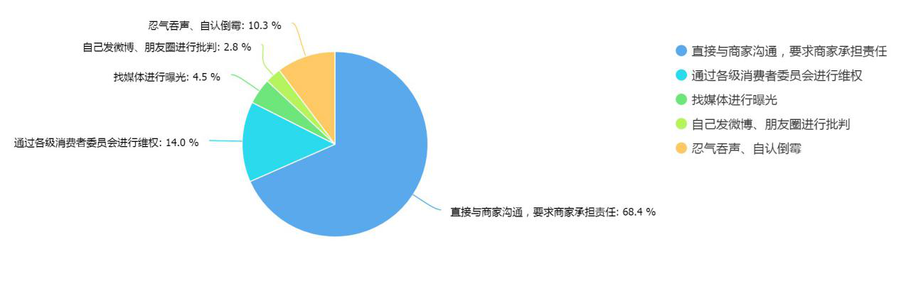 有68.4%的受訪(fǎng)者在遇到消費(fèi)侵權(quán)后選擇直接與商家溝通,要求商家承擔(dān)責(zé)任,10.4%的受訪(fǎng)者會(huì)選擇忍氣吞聲、自認(rèn)倒霉;其中男性消費(fèi)者更傾向于找媒體曝光,而女性消費(fèi)者則傾向于忍氣吞聲。