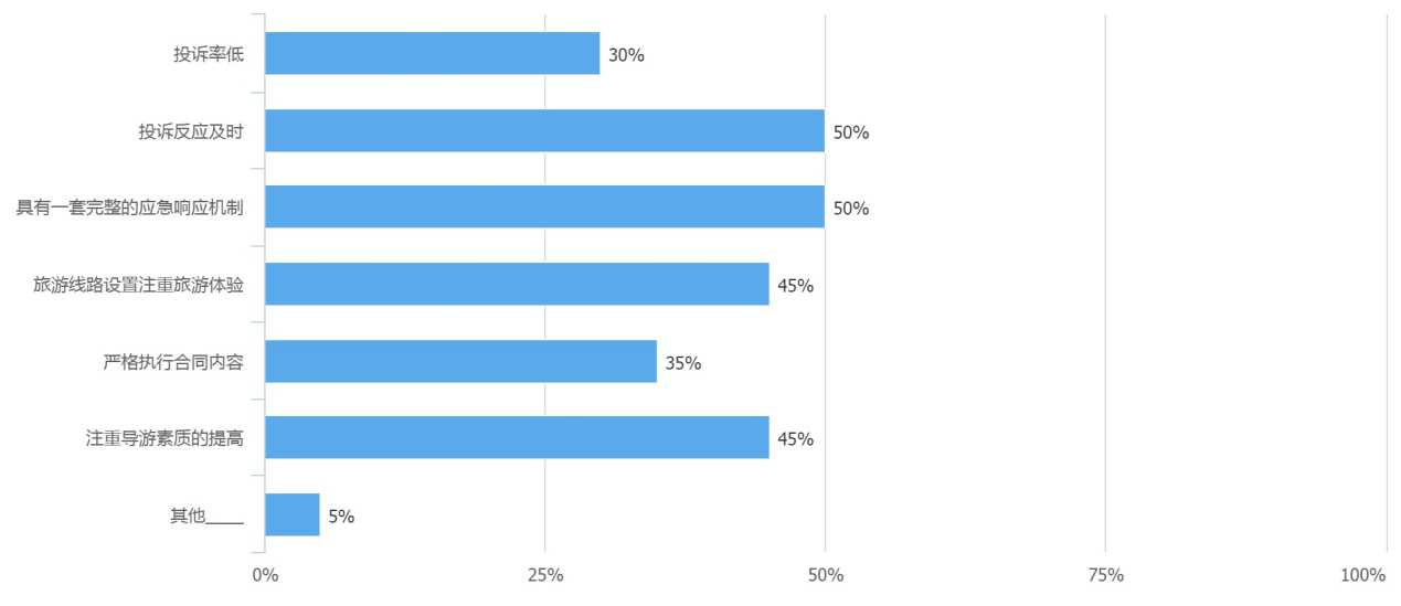 在眾多的旅游體驗(yàn)當(dāng)中,消費(fèi)者遇到的最主要的問(wèn)題是強(qiáng)制購(gòu)物、遭遇虛假宣傳、臨時(shí)更改旅游線(xiàn)路等問(wèn)題,同時(shí)消費(fèi)者在選擇旅游線(xiàn)路時(shí),“野馬旅行社”、導(dǎo)游的服務(wù)態(tài)度、安全等問(wèn)題也在重點(diǎn)考慮范圍內(nèi)。在改進(jìn)旅行社服務(wù)質(zhì)量方面,80%的消費(fèi)者認(rèn)為現(xiàn)狀需要政府和網(wǎng)絡(luò)共同關(guān)注,才能營(yíng)造良好的旅游環(huán)境。旅行社對(duì)于投訴案例的反應(yīng)機(jī)制和反應(yīng)速度,之后也將成為消費(fèi)者在選擇旅行線(xiàn)路時(shí)的重要考量標(biāo)準(zhǔn)之一。
