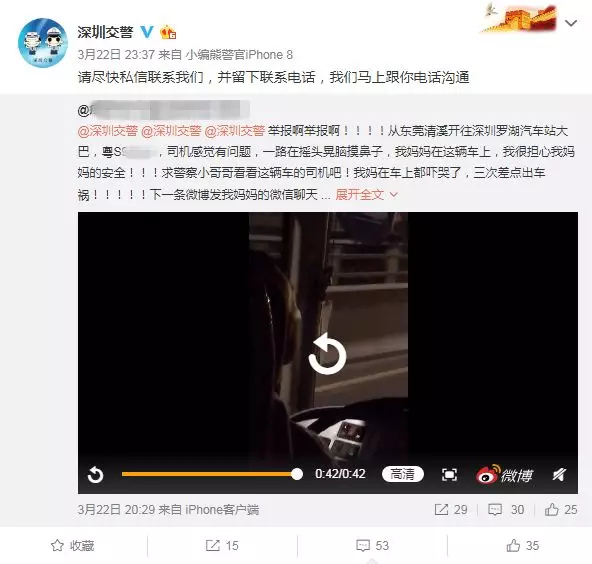 “舉報啊舉報?。。?!大巴車三次差點出車禍!司機一路搖頭晃腦摸鼻子?。。?!”3月22日晚,深圳交警在微博上接到網友舉報。