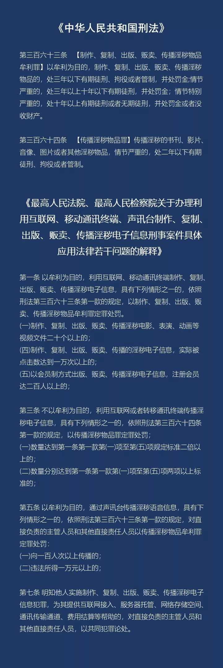 我國《刑法》規(guī)定了對(duì)傳播淫穢物品牟利罪、傳播淫穢物品罪的處罰,而最高法、最高檢2004年9月出臺(tái)的《關(guān)于辦理利用互聯(lián)網(wǎng)、移動(dòng)通信終端、聲訊臺(tái)制作、復(fù)制、出版、販賣、傳播淫穢電子信息的刑事案件具體應(yīng)用法律若干問題的解釋》,又對(duì)此類犯罪認(rèn)定做了詳細(xì)的解釋。
