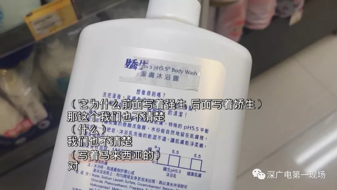 今天上午11點,記者去到中英街街口這家“卓悅”實地調(diào)查。果然看到孔女士圖片上的那款強(qiáng)生沐浴露。有一瓶后面貼紙被刮開,可以看到“嬌生”的字樣。這款1000毫升的強(qiáng)生沐浴露,售價29.9港幣,而另一種包裝,同樣1000毫升的強(qiáng)生沐浴露,前后名字一致,有幾種味道,價格則是每瓶35港幣-38港幣。