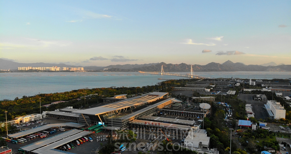 深圳灣口岸和遠(yuǎn)處的深圳灣大橋