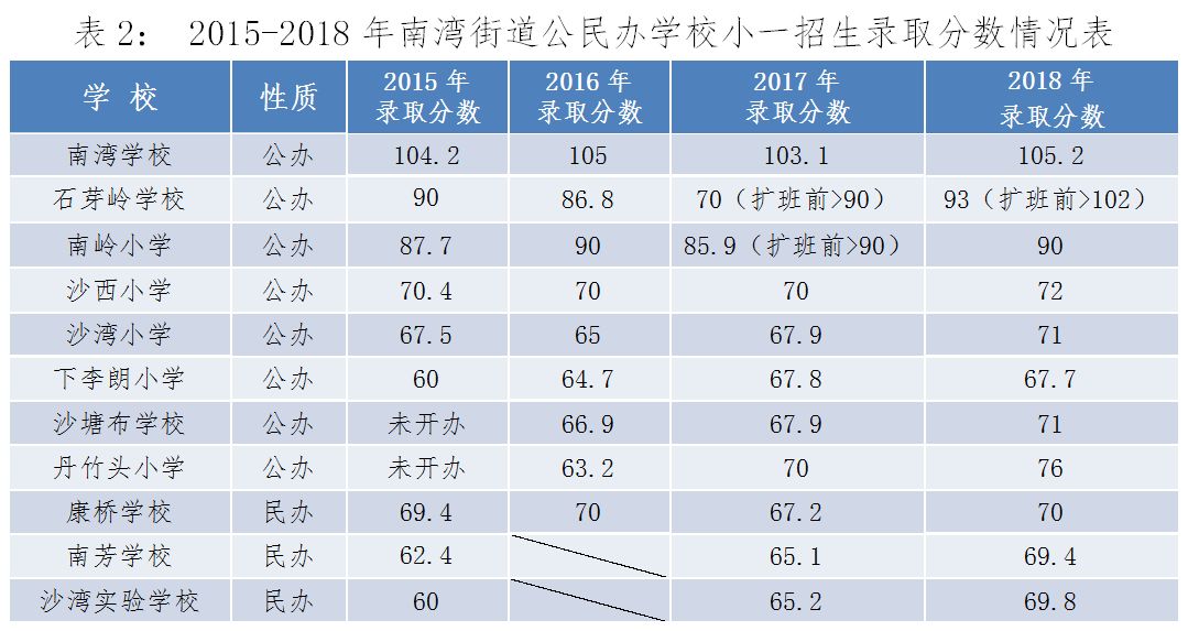 2015—2018年南灣街道公民辦學(xué)校小一招生錄取分數(shù)情況表