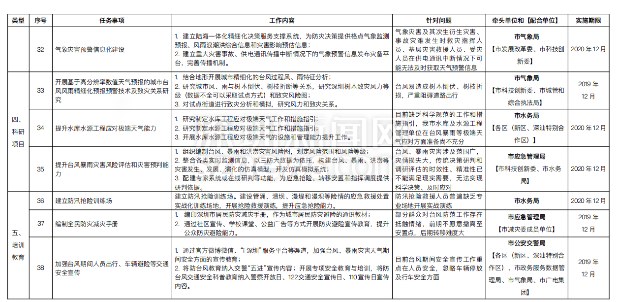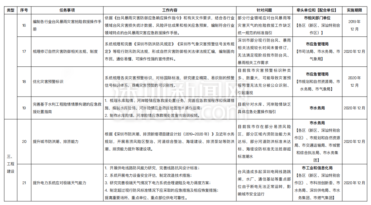 附:《深圳市提升臺風(fēng)暴雨災(zāi)害防御能力重點任務(wù)實施方案一覽表》