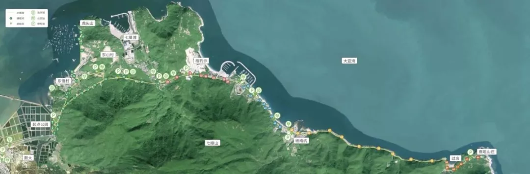 大鵬新區(qū)根據(jù)線路的地形、山海景觀、人文景觀的分布,確定了“打造‘兩線、三段、五大節(jié)點’的濱海生態(tài)自然課堂步道”。據(jù)新區(qū)建筑工務局負責人介紹,從新大河入??诘酱髞啚澈0堵咕讘已拢L18.7公里的海岸線上分布著河流、山林、海灘、溪流、濕地等多樣生態(tài)系統(tǒng)。2017年7月,大鵬新區(qū)按照濱海慢行系統(tǒng)示范工程標準,動工建設新大-鹿嘴市政綠道?!皟删€”指的是沿著海岸的濱海徒步路線和城市二號綠道線,兩條線之間的6.6平方公里土地將形成一座開放的郊野公園;“三段”分別為活力生活段、自然生態(tài)段和休閑旅游段;“五大節(jié)點”為山海綠畔、古廟遺風、東山凹、愛情灘、鹿咀山莊等自然景觀。