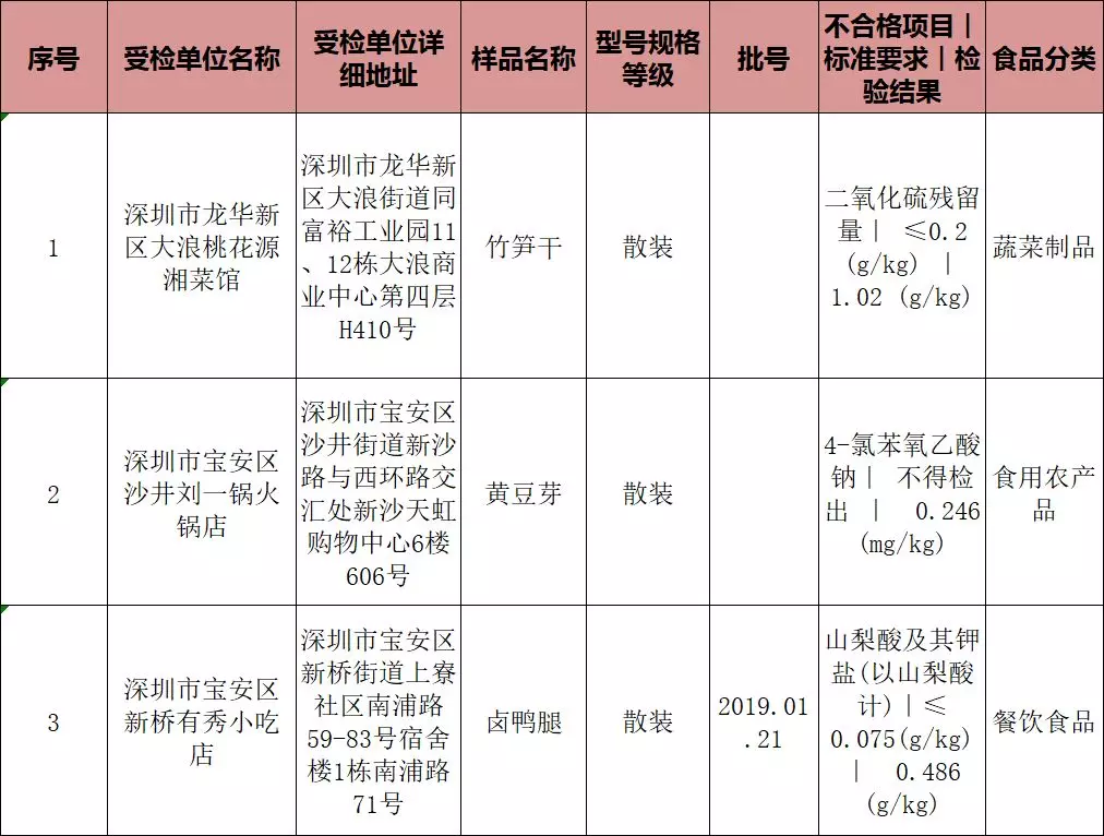 蔬菜制品不合格樣品為竹筍干,不合格受檢單位是深圳市龍華新區(qū)大浪桃花源湘菜館,不合格項(xiàng)目為二氧化硫殘留量。