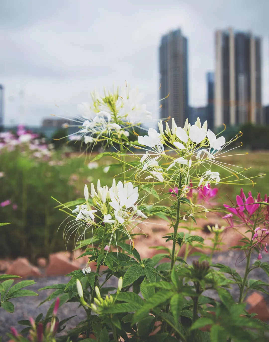乍一看是不是有點(diǎn)像彼岸花?不過它倆卻算不上什么親戚。醉蝶花盛開時,總狀花序形成一個豐滿的花球,朵朵小花猶如翩翩起舞的蝴蝶,靈動迷人。