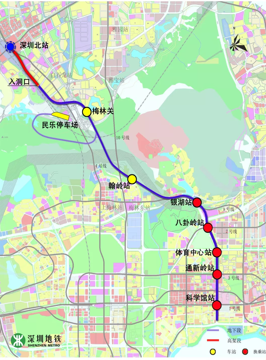 6號(hào)線二期工程線路全長約11.8km,換乘車站5座,線路從深圳北站預(yù)留高架橋工程引出,途徑龍華、福田、羅湖三區(qū),終止于科學(xué)館站。