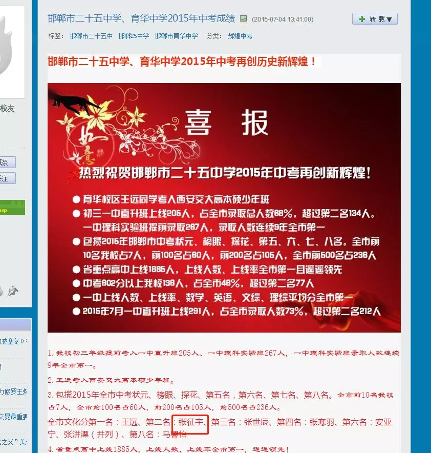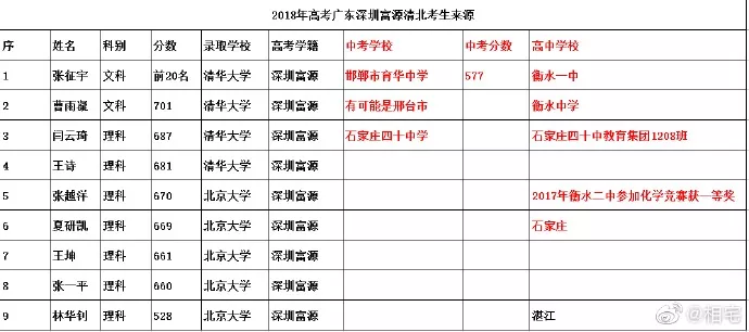近日,深圳高三二模成績出爐,一所學(xué)校引起了深圳家長圈的高度關(guān)注。 有網(wǎng)友在微博上報料富源學(xué)校表現(xiàn)亮眼,一石激起千層浪,事件是怎么一回事呢?一起來看看 2019深二模各校尖子生成績 其中民辦學(xué)校寶安區(qū)富源學(xué)校異軍突起,尖子生占比遠(yuǎn)超深圳最好的四大高中(深圳中學(xué),深圳實驗中學(xué),深圳外國語學(xué)校,深圳高級中學(xué)),引人注目。 網(wǎng)友議論紛紛 網(wǎng)友@相宅稱:深圳富源中學(xué),18年考中清北的學(xué)生名單和初中來源統(tǒng)計,經(jīng)過人肉搜索和大數(shù)據(jù)比對,確認(rèn)相關(guān)證據(jù),有非常大的高考移民嫌疑。廣東高考本來就難,名校指標(biāo)更少,還來擠占惹起公憤。同時附上19年深圳高考二模的富源成績。今年還有沒有高考移民,還會不會擠占廣東的名校指標(biāo)? 針對網(wǎng)上的報料和家長的質(zhì)疑,深圳教育局@深圳教育回應(yīng)稱 情況說明 #情況說明#昨日,有部分家長對富源學(xué)校學(xué)生參加高考的資格提出疑問,我局高度重視,立即啟動調(diào)查。經(jīng)核實,富源學(xué)校在我市申請高考報名的學(xué)生均符合廣東省高考報名資格。根據(jù)《關(guān)于做好廣東省2019年普通高校招生統(tǒng)一考試報名工作的通知》(粵招〔2018〕15號)文件精神,廣東省戶籍學(xué)生可在廣東省內(nèi)報名參加高考;如果為非廣東戶籍,考生(家長)必須具備“兩個合法”、“三個三年”的條件,即具備合法穩(wěn)定職業(yè)、合法穩(wěn)定住所以及學(xué)籍、社保、居住證各滿三年。根據(jù)廣東省高考報名的政策規(guī)定,我市招考部門對所有報名考生的資格進(jìn)行了嚴(yán)格審核。富源學(xué)校學(xué)生(包括戶籍在廣東省內(nèi)深圳市外的)均提供了戶籍所在地公安部門及我市學(xué)籍管理部門對其戶籍、學(xué)籍的審核證明,手續(xù)齊全、資料完整,符合在深圳參加高考的報名條件。 深圳市教育局一直嚴(yán)格執(zhí)行國家高考政策,嚴(yán)格高考報名資格審查。目前,正值考生進(jìn)入高考緊張復(fù)習(xí)階段,我局呼吁大家關(guān)心每一位即將參加高考的孩子,共同營造良好的考前氛圍。 回應(yīng)之下,小編根據(jù)現(xiàn)有的資料,發(fā)現(xiàn)了這些信息出入,一起接著往下看! 對比:富源學(xué)校深圳一模成績 成績單顯示,在前十名單里,富源學(xué)校獨占6位,而深圳四大公辦重點高中總和也只有4位,這是什么情況?對照看一看一模成績: 三年來深圳中考錄取情況: 富源學(xué)??梢娚床徽純?yōu)勢 再來看一看三年來深圳中考錄取情況:富源學(xué)??梢娚床]有什么優(yōu)勢,總分460分的錄取分?jǐn)?shù)比四大重點低了將近100分,但也不能因此說明該學(xué)校沒有尖子生源。 2018年富源學(xué)校高考清北名單:9位同學(xué)上清北 下圖是2018年幾所大學(xué)在廣東(理科)招生計劃: 但是,這幾名考進(jìn)清北的同學(xué),名字竟然出現(xiàn)在兩所不同的高中??? 考進(jìn)廣東前20名的張征宇同學(xué) 網(wǎng)友爆料稱,深圳富源中學(xué)2018年高考喜報,特別宣傳了張征宇同學(xué)(后成功考入清華大學(xué))。而他也出現(xiàn)在2015年的邯鄲市育華中學(xué)中考喜報上。乾坤大挪移,坐地日行八萬里! 家長質(zhì)疑:富源中學(xué)光榮榜的同學(xué) 怎么又出現(xiàn)在衡水中學(xué)喜報上? 針對上面9位同學(xué),搜索信息顯示,竟然有五位同學(xué)來自有名的高考大省河北。 在2018年的第31和32屆化學(xué)奧林匹克競賽的名單上,有一個共同的名字:崔一龍,但他們來自不同的學(xué)校。高二時他在衡水第一中學(xué),高三他出現(xiàn)在深圳富源中學(xué)。 同時,該網(wǎng)友還發(fā)了一封 #一位深圳中學(xué)生家長寫給教育部的控訴信# 尊敬的國家教育部領(lǐng)導(dǎo): 您好! 我是深圳市一名中學(xué)生的家長。這幾日網(wǎng)上流傳出一份深圳市高三年級第二次模擬考試前幾名學(xué)校分布成績單,其中民辦學(xué)校寶安區(qū)富源學(xué)校異軍突起,遠(yuǎn)超深圳最好的四大高中(深圳中學(xué),深圳實驗中學(xué),深圳外國語學(xué)校,深圳高級中學(xué))引起廣大家長的關(guān)注。隨后網(wǎng)上流傳出是富源學(xué)校與河北衡水中學(xué)之間的高考移民消息,具體操作是通過將河北衡水中學(xué)的尖子生戶口轉(zhuǎn)移到深圳富源學(xué)校,平時在衡水中學(xué)上課,考試在深圳富源學(xué)校,并參加深圳市高考。此情況幾年前已有,數(shù)量沒有那么大。今年突然大量此類考生出現(xiàn),大家猜測,如果不加管控未來必將愈演愈烈。 作為一名普通深圳市民和學(xué)生家長,我守法遵紀(jì),但是實在難以接受這樣的現(xiàn)實。希望教育部能夠徹查此事,查明真相,還廣大家長和考生一個公道。 記者調(diào)查 網(wǎng)上傳出深圳高三二模數(shù)據(jù)圖,記者向深圳某中學(xué)老師證實了該表格的真實性。從數(shù)據(jù)中可看到,深圳二模全市前十共有11名,其中富源6名,深圳中學(xué)3名,深圳實驗學(xué)校和市高級中學(xué)各占1名。有家長質(zhì)疑這是富源學(xué)校從衡水中學(xué)引入了高考移民,才導(dǎo)致二模成績一下子拔尖,并已申請要求有關(guān)部門徹查。 同時,小編梳理去年的報道發(fā)現(xiàn),張征宇同學(xué)此前的采訪顯示:張征宇初中
