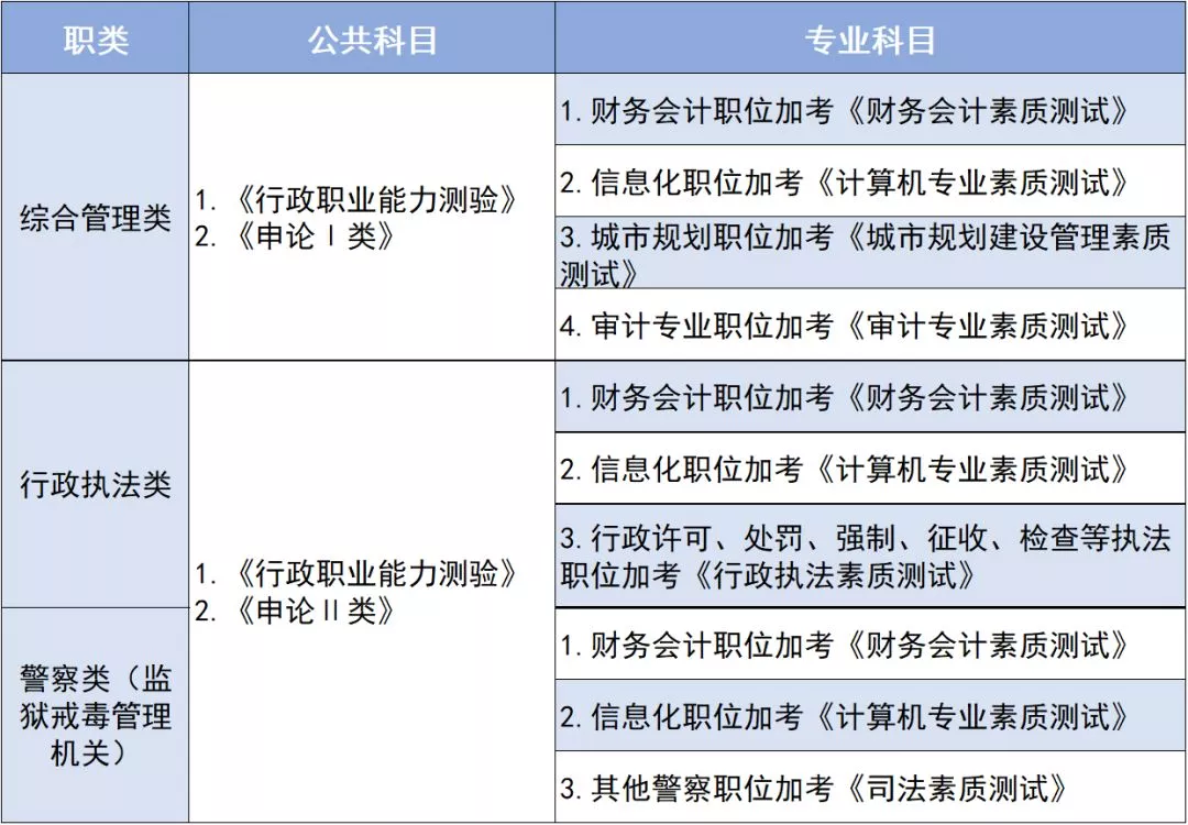 筆試科目:筆試科目按不同職位分別設(shè)置,具體如下: